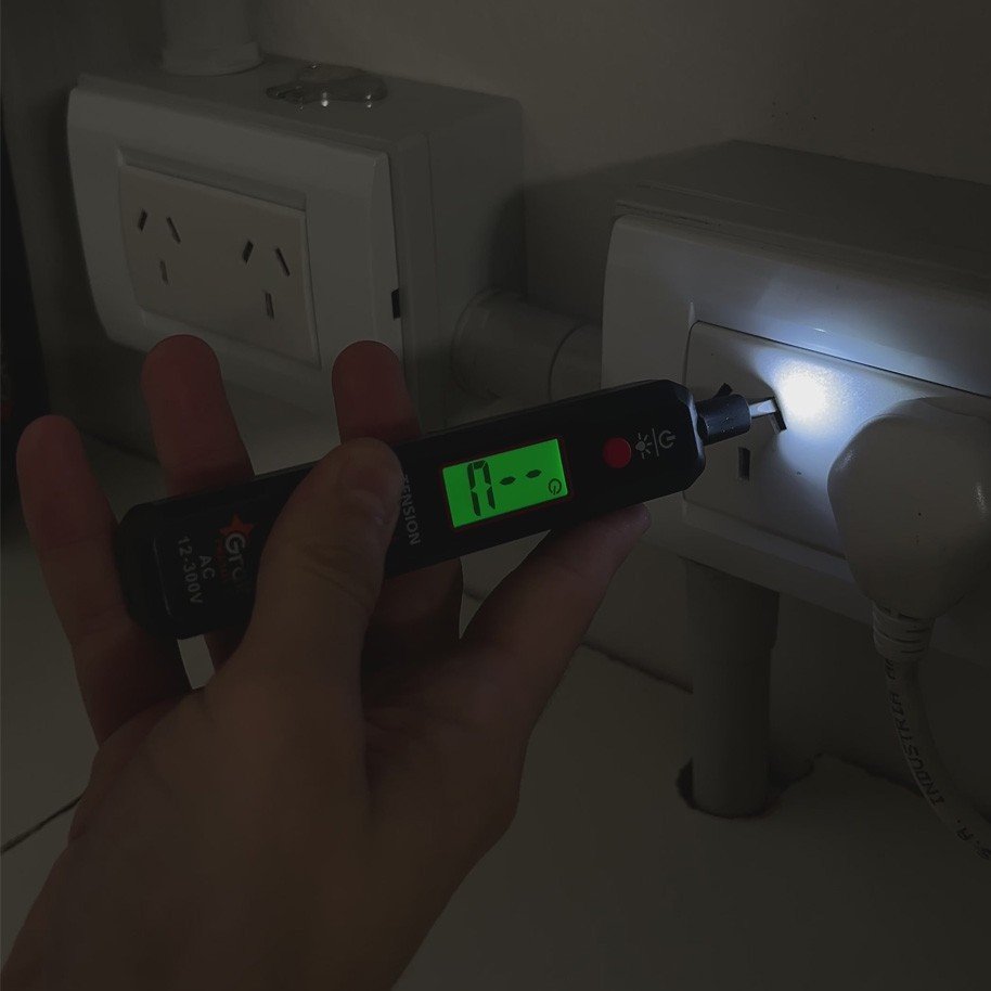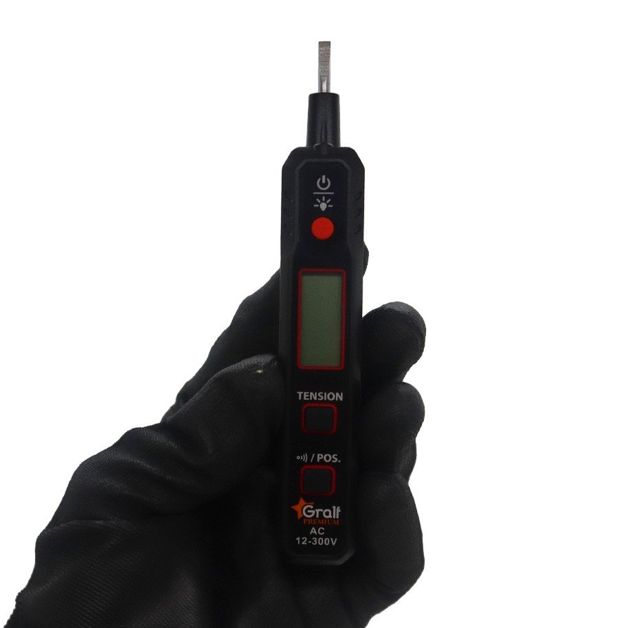 Detector de tensión CA con funciones avanzadas de voltímetro, NCV, continuidad y test de baterías, e iluminación auxiliar.